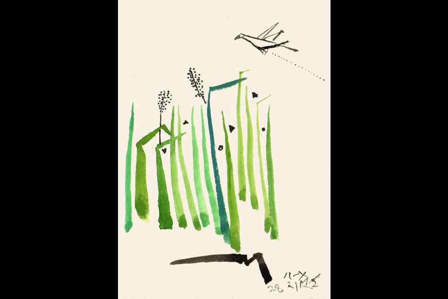 అతని పెద్ద రచనలలో వలె, ఇవి బంగ్లాదేశ్లోని జమాల్పూర్లో వరి పొలాలు మరియు విస్తారమైన జలమార్గాల నెట్వర్క్తో అతని ఇంటిని కవిత్వ జ్ఞాపకాలు. బిర్లా అకాడమీ ఆఫ్ ఆర్ట్ & కల్చర్లో ప్రదర్శించబడిన అతని పెద్ద రచనలలో, కళాకారుడు ఈ థీమ్లు మరియు కంపోజిషన్లను విస్తరించాడు దేబోవశ ఏకరీతి పరిమాణంలో 52 చిన్న-ఫార్మాట్ గౌచే పెయింటింగ్లను ప్రదర్శించింది. హలోయ్ తన వయస్సులో ఎంత ఉత్పాదకతను కలిగి ఉన్నాడో ఆశ్చర్యంగా ఉంది. అన్ని రచనలు సంక్షిప్తలిపిలో ఉన్నప్పటికీ, హలోయి యొక్క లక్షణాలను కలిగి ఉన్నాయి. గడ్డి పొలం (చిత్రం, కుడివైపు), సజల మొక్కలు మరియు వాటి ప్రతిబింబాలు, నదీతీర భూమి మరియు వరి పొలాలు సరళమైన మరియు తరచుగా రేఖాగణిత రూపాలకు మరియు వాటి వివిధ ఆకృతీకరణల మీదుగా ఎగురుతూ ఒక చిన్న పక్షిని చిత్రించినప్పుడు కళాకారుడు ఉల్లాసభరితమైన మానసిక స్థితిలో ఉన్నట్లు అనిపిస్తుంది. వారి స్వంత లయలను కలిగి ఉంటాయి. ఈ ఖాళీలు కళాకారుడి ఊహలో ఉన్నాయి మరియు వాటి ప్రకాశం మరియు రంగులో కాలిడోస్కోప్ లోపల మారుతున్న నమూనాలను పోలి ఉంటాయి.