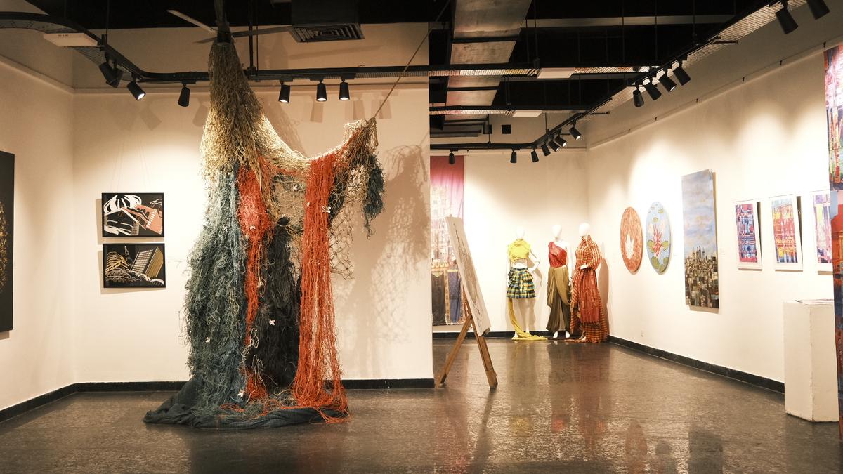 గోడకు అవతలి వైపున పసుపు రంగు కాన్వాస్, ఒంటరిగా ఉన్న బట్టను కలిగి ఉంటుంది, ప్రతి ఒక్కటి దానిని ధరించిన వ్యక్తి యొక్క కథను చెబుతుంది. ఉత్తర చెన్నైలోని ఫిషింగ్ హబ్ కాసిమేడు మరియు దాని ప్రజల నుండి ప్రేరణ పొందిన నీలం మరియు తుప్పు నారింజ షేడ్స్లో చేపలు పట్టే వలల యొక్క ఆసక్తికరమైన, చిక్కుబడ్డ నెట్కు చాలా దూరంలో ఉంది. మరొక ఉపరితలంపై, తమిళనాడు గోడలను అనుకరించే నీలిరంగు వృత్తాకార డిస్క్లు ఉన్నాయి, ఇవి తరచుగా చిరిగిన పోస్టర్లు మరియు అసంపూర్ణ అక్షరాలను కలిగి ఉంటాయి, విధ్వంసకతను తమిళంలో అయుత ఎళుతు భావనతో పోల్చడం ద్వారా ఒక వ్యక్తీకరణ రూపంగా వివరిస్తాయి.