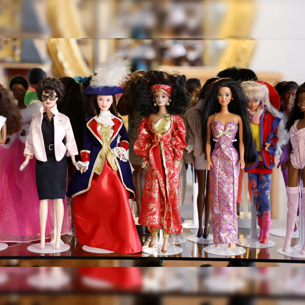 1959లో విడుదలైన మొదటి బార్బీ యొక్క మొదటి ఎడిషన్, అందగత్తె జుట్టు, కోణీయ కళ్ళు, నలుపు-తెలుపు స్విమ్సూట్ ధరించి, వివిధ జాతులు, జుట్టు అల్లికలు మరియు ఆకారాలను సూచించే తదుపరి నమూనాలతో పాటు ప్రదర్శనలో ఉంది. ఇతర బ్లాక్ బార్బీ మరియు వీల్ చైర్లో ఒకటి ఉన్నాయి. వృత్తిపరమైన పాత్రలకు అంకితమైన ఒక విభాగంలో పోలీసు అధికారి, శాస్త్రవేత్త, వైద్యుడు, అధ్యక్షులు మరియు ఓటరు ఉంటారు, మరొకటి 1961లో పరిచయమైన బార్బీ యొక్క దీర్ఘకాల సహచరుడు కెన్పై దృష్టి పెడుతుంది.