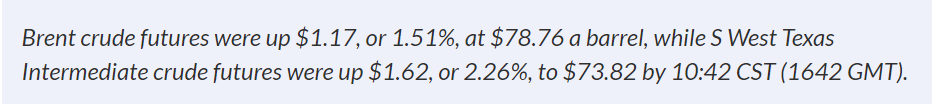 బ్రెంట్ క్రూడ్ ఫ్యూచర్స్ $1.17 లేదా 1.51% పెరిగి బ్యారెల్ $78.76 వద్ద ఉండగా, S వెస్ట్ టెక్సాస్ ఇంటర్మీడియట్ క్రూడ్ ఫ్యూచర్స్ $1.62 లేదా 2.26% పెరిగి 10:42 CST (1642 GMT) నాటికి $73.82కి చేరుకున్నాయి.