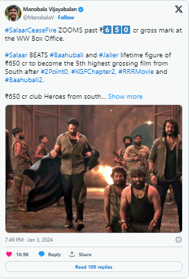ప్రపంచవ్యాప్తంగా బాక్సాఫీస్ వసూళ్ల పరంగా, ‘సాలార్: పార్ట్ 1 – కాల్పుల విరమణ’ రూ. 650 కోట్ల గ్రాస్ మార్క్ను అధిగమించింది. ట్రేడ్ నిపుణుడు మనోబాల విజయబాలన్ X (గతంలో ట్విటర్)లో తాజా ప్రపంచవ్యాప్తంగా కలెక్షన్లను పంచుకున్నారు మరియు ఇలా వ్రాశారు, “#2Point0, #KGFChapter2, #RRRMovie తర్వాత సౌత్ నుండి ఐదవ అత్యధిక వసూళ్లు సాధించిన చిత్రంగా సాలార్ బాహుబలి మరియు జైలర్ జీవితకాల ఫిగర్ రూ.650 కోట్లను అధిగమించింది. మరియు #బాహుబలి2.”