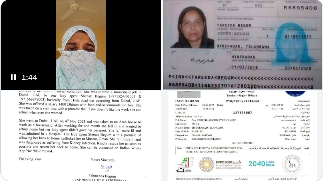 ఫరీదా సోదరి ఫహ్మీదా బేగం ప్రభుత్వానికి రాసిన లేఖను జనవరి 4, గురువారం నాడు MBT నాయకుడు అమ్జెద్ ఉల్లా ఖాన్ Xలో పంచుకున్నారు.తన సోదరి కష్టాలను వివరిస్తూ, ఫహ్మీదా మాట్లాడుతూ, “దుబాయ్, UAEలో పనిచేస్తున్న హైదరాబాద్కు చెందిన ఏజెంట్ షెనాజ్ బేగం, అరబ్ ఇంట్లో ఇంటి పనిమనిషిగా పనిచేయడానికి తన సోదరికి 1400 దిర్హామ్లకు (రూ. 31,726) దుబాయ్లో ఉద్యోగం ఇచ్చింది. ఒప్పందం ప్రకారం, ఆమె తన పనిలో సంతృప్తి చెందకపోతే, ఎప్పుడైనా తిరిగి రావచ్చని వాగ్దానం చేయడంతో నవంబర్ 4, 2023న ఆమె దుబాయ్ వెళ్లింది.