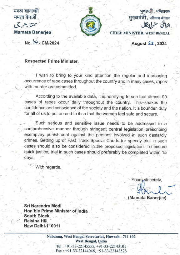 దేశవ్యాప్తంగా రోజుకు 90 అత్యాచారాలు నమోదవుతున్నాయని ఆందోళన వ్యక్తం చేశారు. ఇలాంటి కేసుల విచారణకు ఫాస్ట్ ట్రాక్ కోర్టులను ఏర్పాటు చేయాలని, విచారణ 15 రోజుల్లో పూర్తవ్వాలని, బాధితులకు న్యాయం జరిగేలా చూడాలని లేఖలో ప్రధానిని కోరారు.