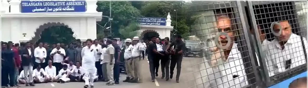 తెలంగాణ అసెంబ్లీలో ఇవాళ గందరగోళం నెలకొంది. బీఆర్ఎస్ ఎమ్మెల్యేలను పోలీసులు అరెస్ట్ చేశారు. శాసనసభ ముందు నిరసన తెలిపిన వారిని అరెస్టు చేసి అక్కడి నుంచి తరలించారు. కేటీఆర్, హరీశ్ రావు, ఇతర బీఆర్ఎస్ ఎమ్మెల్యేలను మార్షల్స్ అమాంతం ఎత్తుకెళ్లి పోలీసు వాహనాల్లో ఎక్కించారు. అనంతరం అక్కడి నుంచి బీఆర్ఎస్ పార్టీ కార్యాలయానికి తీసుకెళ్లారు. బుధవారం (జూలై 31) ముఖ్యమంత్రి రేవంత్ రెడ్డి బీఆర్ఎస్ మహిళా సభ్యులను అవమానించారని, సీఎం రేవంత్ క్షమాపణ చెప్పాలని సభ్యులు డిమాండ్ చేశారు. ఈ అంశంపై ఇవాళ ఉదయం అసెంబ్లీ స్పీకర్కు వాయిదా తీర్మానం కూడా ఇచ్చారు. ఉదయం నల్లబ్యాడ్జీలు ధరించి అసెంబ్లీకి వచ్చారు.